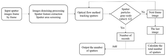 Figure 3 shows a single frame image of spatter captured by a high-speed camera. Figure 3a,b represent the spatter behavior under two scanning methods, LSD-W and LSD-A, respectively. Molten pool, plume, and droplet spatters information can be obtained from the images. It is necessary for some of the spatters in the image to seem out of focus due to the various spray directions in the forming chamber and the camera’s restricted depth of field. Figure 4 is the flowchart of the image processing process. First, the initial single frame images after shooting are denoised and threshold segmented one by one, and extracted spatter features. The extracted spatters are filtered for area, and the molten pool and plume that do not match the spatter characteristics are removed. Then, the optical flow method is used to track the spatters and find the corresponding relationship between the spatters in the single frame images. The principle of the optical flow method proposed by Lucas Kanadeis [36] assumes that there are two adjacent video images, A and B, with any pixel point, such as in A (, being the pixel coordinates). After , the corresponding pixel point in B is . Due to the small , it can be considered that the pixel points are equal in ideal conditions, and the equation is: