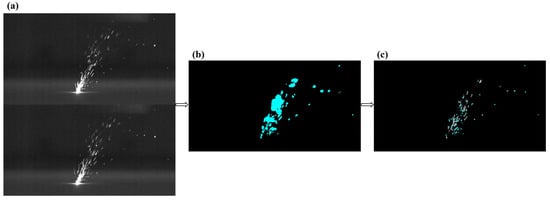 Spatter image processing results using optical flow method: (a) Adjacent two frames of images; (b) Calculate optical flow vector and spatters’ ROI area; (c) Identify spatters’ motion trajectory and record coordinates.