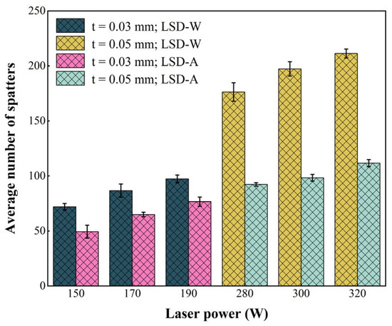 Average number of spatters at different laser powers: the laser power (150 W, 170 W, 190 W) corresponds to the powder layer thickness of 0.03 mm; the laser power (280 W, 300 W, 320 W) corresponds to the powder layer thickness of 0.05 mm.