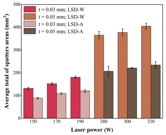 Figure 7 shows the statistical results of the average number of spatters generated by LSD-W and LSD-A under six different laser powers. From the statistical results, the number of spatters generated increases with the increase of laser power, and the number of spatters generated by LSD-W is more than that generated by LSD-A at the same laser power. Overall, the number of spatters generated under high laser power at a powder layer thickness of 0.05 mm is greater than that under low laser power at a powder layer thickness of 0.03 mm. Furthermore, when the powder layer thickness is 0.05 mm and the laser power is 280 W–300 W under the same laser power, the growth rate of the number of spatters generated by LSD-W relative to LSD-A is much higher than that of the powder layer thickness of 0.03 mm when the laser power is 150 W–190 W. Under the action of 300 W laser power, the number of spatters generated in LSD-W increased by 101% compared to LSD-A, and under the action of 150 W laser power, the number of spatters generated in LSD-W increased by 47% compared to LSD-A. Analyzing the impact of process parameters on spatters’ behavior only based on the number of spatters is insufficient and should also consider the area of the spatters. Due to the gradual dimming of the brightness of the spatters during the motion of the PBF-LM process as the temperature decreases, it is difficult to statistically analyze the size of the spatter areas. Therefore, this study only extracts the maximum area of the single frame images of the spatters’ process under different process parameters captured by a high-speed camera for comparison and analysis. Figure 8 shows the statistical results of the spatter areas produced by LSD-A and LSD-W under six different process parameters. The spatter areas increase with the increase of laser power, and the spatter areas produced by LSD-W are larger than that produced by LSD-A under the same laser power. The spatter areas produced under high laser power and high powder layer thickness parameters are much higher than that produced under low laser power and low powder thickness parameters.