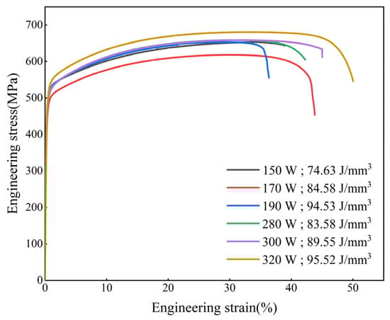 Stress–strain curves of printed samples: the laser power (150 W, 170 W, 190 W) corresponds to the powder layer thickness of 0.03 mm; the laser power (280 W, 300 W, 320 W) corresponds to the powder layer thickness of 0.05 mm.