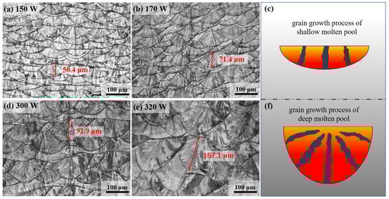 Optical microscope observed the morphology of molten pool of the printed sample under different laser powers: (a) Powder layer thickness 0.03 mm, laser power 150 W; (b) Powder layer thickness 0.03 mm, laser power 170 W; (c) Grain growth process of shallow molten pool; (d) Powder layer thickness 0.05 mm, laser power 300 W; (e) Powder layer thickness 0.05 mm, laser power 320 W; (f) Grain growth process of deep molten pool.