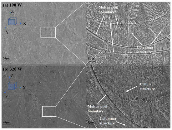 Microstructure of samples under different laser powers observed by SEM: (a) The X-O-Z microstructure of 190 W sample; (b) The X-O-Z microstructure of 320 W sample.