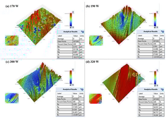 Surface roughness test of samples by optical profiler: (a) Surface topography of sample 170 W; (b) Surface topography of 190 W sample; (c) Surface topography of 300 W sample; (d) Surface topography of 320 W sample.