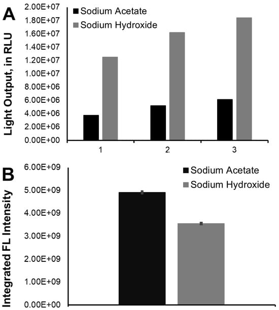 (A): Total light output (area) measured for F-CLA in either DMSO/sodium acetate buffer pH 5.2 or in DMSO/sodium hydroxide. The number 1 accounts for the first 50 s of the reaction, 2 accounts for the first 100 s, and 3 accounts for the first 300 s. (B): Integrated fluorescence (FL) intensity (area of the spectrum) measured for F-CLMD in either DMSO/sodium acetate buffer pH 5.2 or in DMSO/sodium hydroxide, with excitation at 300 nm.