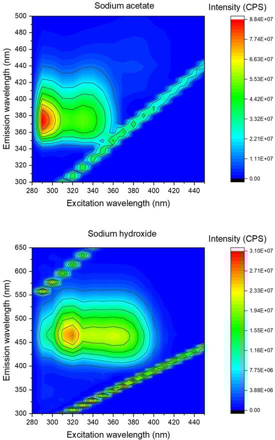 Contrary to this hypothesis, we found that the integrated fluorescence intensity was relevantly higher at acidic pH than at basic pH (Figure 2B). This result points to the fluorescence quantum yield of neutral F-CLMD being higher than that of the corresponding anionic species. It should be noted that the absorbance measured at 300 nm, in either DMSO/sodium acetate or DMSO/sodium hydroxide, was not the same. In fact, it was lower in the former mixture than in the latter mixture (0.06 versus 0.14). Thus, it is expected that F-CLMD absorbs more photons at basic pH than in acidic conditions. However, despite this, the integrated fluorescence intensities were lower in basic conditions, as mentioned before (Figure 2B). Considering the notion that fluorescence quantum yield is the ratio of absorbed photons to photons emitted via fluorescence, these results indicate that this parameter is lower for anionic F-CLMD than for the corresponding neutral species. This is consistent with the 2D excitation–emission contour plots, in which the overall fluorescence intensities were lower under basic conditions than in an acidic buffer (Figure 3).