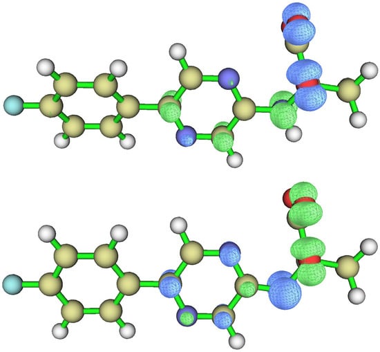 To assess the electron transfer of both TS structures, we plotted their electron spin density isosurfaces (Figure 4). These were obtained using MultiWFN software, v. 3.8 [71], considering the calculations at the ωB97XD/6-31+G(d,p) level of theory (with Gaussian 09). The results obtained for the anionic species are consistent with existing literature regarding dioxetanones with this deprotonation state [1,2,23,33,50,51,52,60,61,66,67]. Namely, the electron spin density was delocalized between the two oxygen heteroatoms that constitute the peroxide O-O bond and the amidopyrazine moiety (with a focus on the deprotonated amide). This indicates that reaching the TS structure is associated with electron transfer between the amidopyrazine structure and the dioxetanone moiety, as is consistent with the CIEEL mechanism [1,2,23,33,50,51,52,60,61,66,67]. In fact, Saito and co-workers mentioned that the nitrogen anion could serve as a strong electron donor [48].