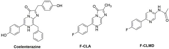 Schematic depiction of native Coelenterazine, F-CLA, and F-CLMD.