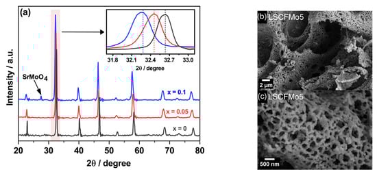 LSCFMox (x = 0, 0.05, 0.1) powder was synthesized successfully by the modified auto-combustion method, including PEG 20000 in addition to EDTA and citric acid as fuel aids. EDTA and citric acid can chelate to metal cations very strongly which subsequently increases the activation energy for metal cations reduction which is accompanied by a slow combustion process. This hampers the desired perovskite structure formation [32]. The polymer PEG 20000 was added in the current investigation to improve the combustion intensity, which led to pure phase formation. This is because PEG and other polymeric fuels form complexes with non-chelated cations not by covalent bonding but rather by trapping them inside the shell of a kind of micelle [33]. Due to weak interactions with polymeric chains, the metal cations that are chelated in this manner can be reduced more quickly. This compensates for citric acid’s less intense combustion and increases the final yield [34,35]. The XRD pattern in Figure 1a indicates that the LSCFMo rhombohedral phase is synthesized successfully. The peaks shift to lower angles by increasing the Mo dopant at the B-site. This is both due to the larger ionic radii of Mo6+ (0.59 Ǻ) with respect to Fe4+ (0.58 Ǻ) and Co4+ (0.53 Ǻ) and because, after Mo doping, some Fe4+ and Co4+ are reduced to Fe3+ and Co3+ to fulfill electroneutrality in the structure [36]. The peak at about 27.5° is related to 5 wt% SrMoO4 that was detected as an impurity in LSCFMo10 powder. The real Mo dopant amount was found to be around 8% instead of 10%, using peak analysis Maud software. This indicates that Mo could not be doped completely into B-site and is assumed to be the result of pH variations during powder synthesis. At lower and higher pH, cations’ oxidation state changes and this hampers their participation in the formation of the desired crystal structure [33]. SEM pictures of LSCFMo5 are shown in Figure 1b,c which reveals a very porous structure with particles of the size 50–200 nm. The same morphology was observed for LSCF and LSCFMo10.