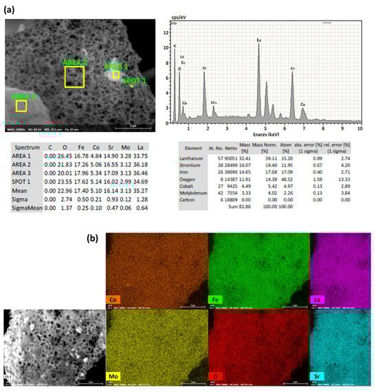 Elemental analysis of the synthesized LSCFMo is shown in Figure 2. As proven by the compositional profile of the particles in different spots in Figure 2a, the powder composition is homogeneous. Elemental distribution of LSCFMo is shown in Figure 2b. The elements La, Sr, Co, Fe, and Mo are distributed homogeneously in the powder and no obvious secondary phase or segregation after synthesis and calcination is observed.