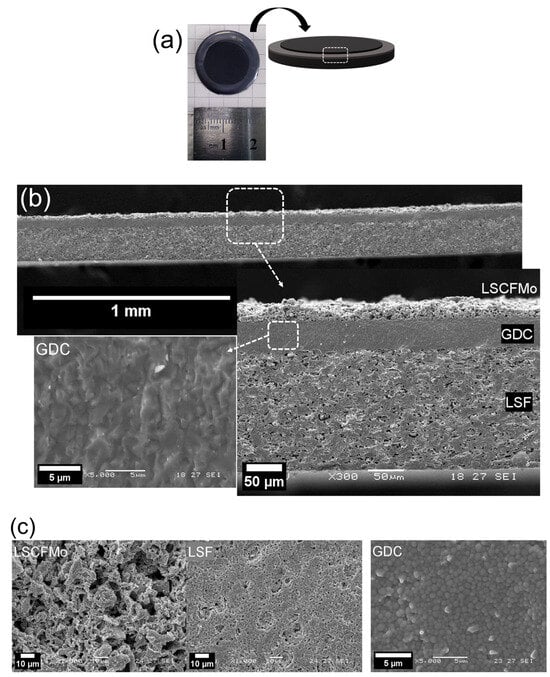 Gadolinium-doped ceria (GDC) electrolyte layer was prepared by tape casting. For the slurry preparation, water as a solvent and DARVAN 821-A as a dispersant (1.2 wt%) were mixed and GDC commercial powder (Ga0.9Ce0.1O1.95—GDC10, SSA = 10–15 m2/g) was added to the mixture until achieving 75% of solid loading. The mixture was ball-milled for 3 h in a Turbula (T2F, WA BACHOFEN AG, CH) mixer and then Duramax B1000 was added as a binder agent. The lanthanum strontium ferrite—LSF cathode layer was prepared by a similar tape casting procedure, using LSF commercial powder (La0.8Sr0.2FeO3−δ—LSF20, SSA = 9.7 m2/g, NexTech Materials). To achieve the necessary porous structure for the cathode, the solid loading was optimized at 47%, and corn starch (10 wt%) was added as a pore former together with the LSF powder. PEG4000 was added as the plasticizer together with Duramax B1000 binder at an appropriate ratio (1.0 wt%) in LSF slurry. The ratio between the plasticizer and binder was finely tuned to achieve a green tape with enough flexibility and, at the same time, good mechanical stability. The mixtures were mechanically stirred for 2 h at 150 rpm. Afterward, the suspensions were cast on a polyethylene terephthalate (PET) tape carrier using a doctor blade apparatus with a gap of 80 and 900 μm for GDC and LSF, respectively. The relative humidity in the chamber was controlled at 70%. The cast tapes were dried after 72 h. Then, GDC and LSF green tapes were laminated together by a Carver hydraulic thermopress (20 MPa/75 °C/10 min, FRED S. CARVER INC., Menomonee Falls, WI, USA) to produce the GDC|LSF half-cell.