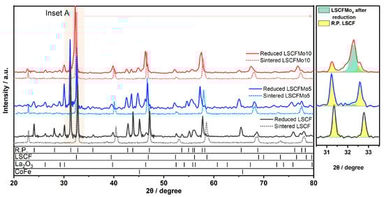 XRD analysis was used to investigate the influence of Mo6+ doping and partial replacement for Fe4+ on the phase and microstructural stability of LSCF, as shown in Figure 4. After the reduction in H2, LSCF was entirely dissolved into R.P. oxides and CoFe alloy nanoparticles. The phase stability was improved by increasing the Mo dopant concentration. LSCFMo5 dissolved into R.P. oxides and CoFe nanoparticles but it retained some of its perovskite rhombohedral structure. This is in contrast with respect to LSCFMo10, which demonstrated excellent phase stability after reduction and could be retained up to 60% with just a small quantity of newly produced R.P. oxides. The peak ratio between the residual perovskite (green in Figure 4) and the newly created R.P. oxides (yellow) after reduction is shown in the inset (A) of Figure 4. By increasing the Mo dopant, this ratio increases. It is thought that under low partial oxygen pressures, an ion with a large radius, such as Mo6+ in the B-site, can accommodate Sr3+ in the A-site, suppressing Sr activation and dissolution [37]. Furthermore, Mo6+ can moderate further reduction in Fe3+/Fe2+ into the metallic phase, thus preventing the collapse of the perovskite structure. This is because the redox bands of mixed-valent Mo5+/Mo6+ and Fe3+/Fe2+ couples overlap [38]. The main peak for LSCFMo is shifted before and after reduction thus pointing out a variation of the unit cell volume and parameters induced by the heat treatment but not corresponding to some kind of decomposition.