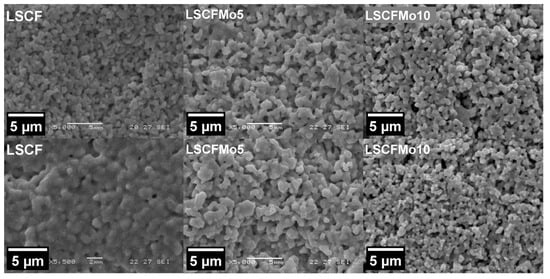 Figure 5 shows the SEM images taken from the surface of as-sintered and reduced LSCFMo tapes. Along with the results from XRD, the tape LSCFMo10 shows the most retained microstructure and porosity following reduction. The LSCFMo5 tape shows a larger grain size and higher (about 30%) bulk density after reduction. Due to the complete decomposition of LSCF after reduction and the larger cell volume of R.P. oxides with respect to LSCF, the bulk density is increased by about 70%.