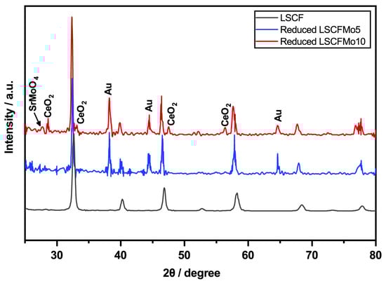 XRD pattern of LSCF, LSCFMo5, and LSCFMo10 after reduction in Ar/H2 at 900 °C for 10 h.
