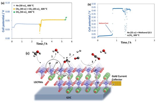 OCV measurements at 600 °C of the cells fed by (a) He, biogas, and pure methane and (b) He and methanol. (c) Suggested schematic of “shuttle mechanism” in methanol oxidation on Mo-doped LSCF.