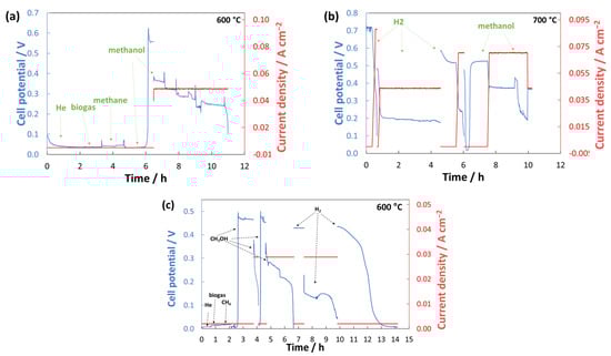 Short-term durability of cells (a) Mo5 at 600 °C, (b) Mo5 at 700 °C, and (c) Mo10 at 600 °C.