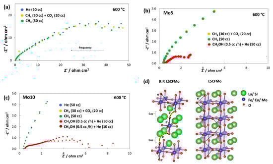 Figure 9b,c show the EIS spectra from the cells Mo5 and Mo10, respectively, fed by methanol. The series resistance is as low as 0.14 Ω cm2 in Mo10 which indicates the good innovative configuration and design of the cell. At least two RQ elements are visible in both cells, with additional semicircles in Mo10. The first and second RQ are related to the dehydrogenation of methanol, and CO and H2 oxidations on the anode side, respectively. It was previously confirmed that LSCFMo10 preserves the perovskite structure under reducing conditions, while LSCFMo5 is more decomposed to R.P. oxides. Figure 9d shows LSCFMo and its R.P. oxide structure. Higher reduction stability in LSCFMo10 can protect the bond bridge Fe3+–O–Fe4+ in the structure which prevents further increase in the activation energy of electron transfer [19,40]. Whereas, in LSCFMo5, more activation energy is required to transfer the electron due to the gap between layers. As a result, the first semicircle which is affected by the activation control of anodic reactions is smaller in Mo10 than in Mo5. A similar result in enhancing charge transfer by Mo doping into lanthanum ferrites was proved by Hou et al. [40], who showed that higher reduction stability can also bring about an increase in electroconductivity of Mo-doped La0.6Sr0.4Fe0.9Ni0.1O3−δ, at a wide temperature range (500-–850 °C). The additional RQ elements in Mo10 are related to O2 reduction on the cathode side and the adsorption and dissociation of dry organic molecules which gets facilitated as the He carrier arises. The total polarization resistance is larger in cell Mo5 than in Mo10.