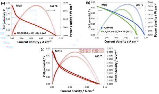Polarization curves for the cells (a,b) Mo5 at 600 °C and 700 °C, and (c) Mo10 at 600 °C.