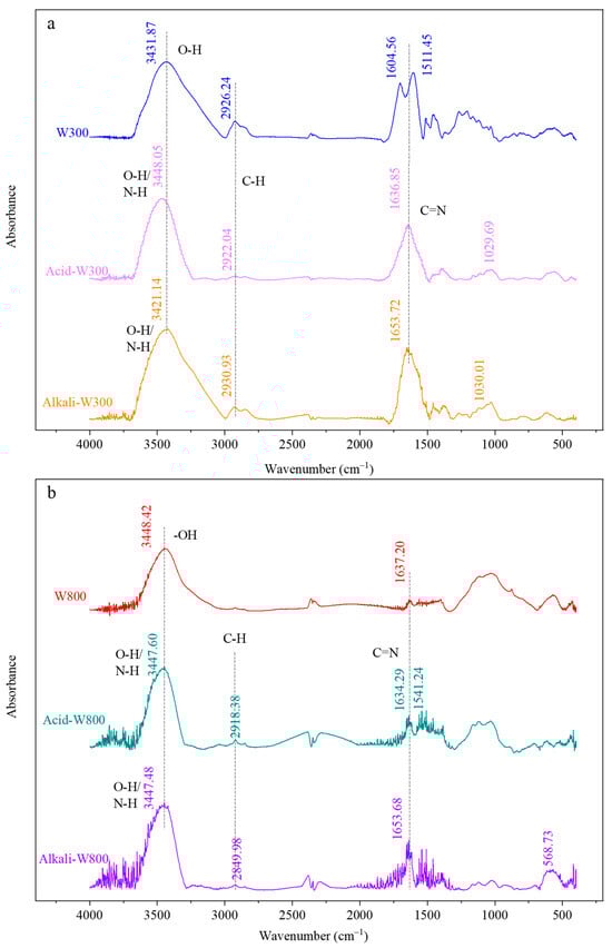 The FT-IR of the original biochar and the PEI-modified biochar showed that a new peak appeared at near 1626.85 cm−1 in Acid-W300, Alkali-W300, Acid-W800, and Alkali-W800 (Figure 1). This peak presented a C=N stretching vibration absorption peak, indicating that the Schiff-base reaction occurred between the carbonyl group and the amino group on glutaraldehyde.