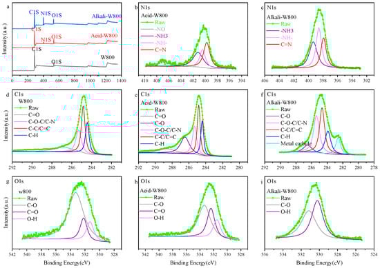 XPS spectra of PEI-modified biochar at 300 °C before and after modification. The (a) is the XPS spectrum before and after PEI modification at 300 °C; (d,g) are the C1s and O1s sub-peaks of biochar at 300 °C before PEI modification, respectively. (b,e,h) are the sub-peak diagrams of N1s, C1s, and O1s of Acid-W300, respectively. (c,f,i) are sub-peak diagrams of N1s, C1s, and O1s of Alkali-W800, respectively. The descriptions of the treatments are in the footnote of Table 1.