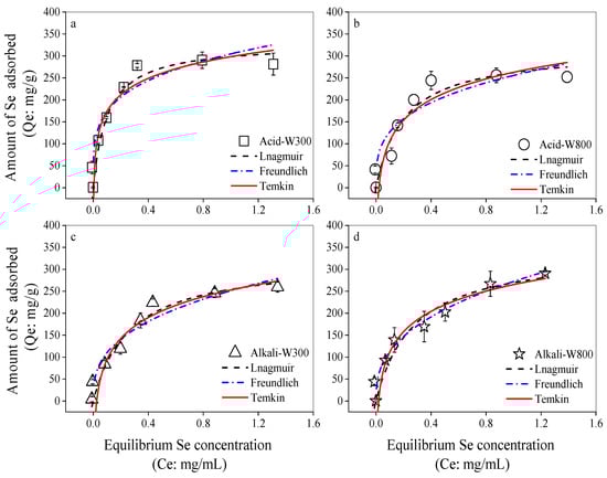 A total of 5 mg of Acid-W300, Alkali-W300, Acid-W800, and Alkali-W800 biochar were added into a conical flask with 5 mL of 0.1 g Se/L, 0.3 g Se/L, 0.5 g Se/L, 0.8 g Se/L, 1 g Se/L, 1.5 g Se/L, or 2.0 g Se/L of the NaSeO3 solution with a solution pH of 7.0, respectively. The conical flasks were shaken in 25 °C conditions at 200 r/min for 24 h. An amount of 2 mL of the samples was collected with a syringe from the conical flasks, and then the remaining selenium in the solution was analyzed by the atomic fluorescence method after being filtered with 0.22 μm of the filter membrane. The batch adsorption experimental data were fitted with the Langmuir adsorption isotherm (1), Freundlich adsorption isotherm (2), and Temkin adsorption isotherm (3) [18]: