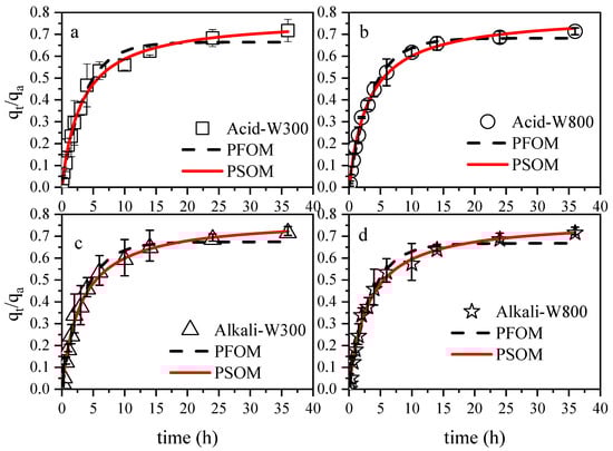 Kinetic adsorption curves of Acid-W300 (a), Acid-W800 (b), Alkali-W300 (c), and Alkali-W800 (d) with PFOM and PSOM models.
