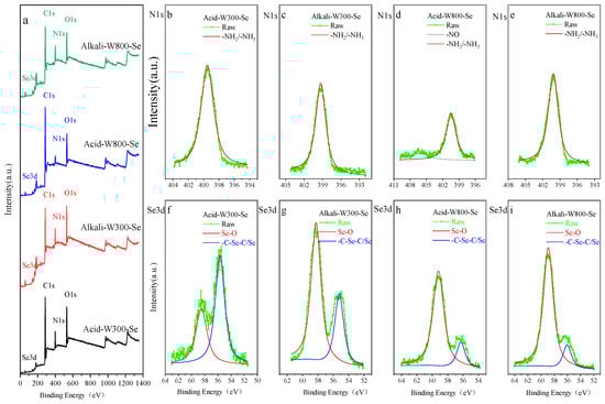 XPS spectra of PEI-modified biochar after SeO32− adsorption. (a) is the full XPS spectrum of PEI-modified biochar after SeO32− adsorption; (b–e) are the N1s sub-peaks of Acid-W300, Alkali-W300, Acid-W800, and Alkali-W800 after SeO32− adsorption, respectively. (f–i) are the Se3d sub-peaks of Acid-W300, Alkali-W300, Acid-W800, and Alkali-W800 after SeO32− adsorption, respectively.