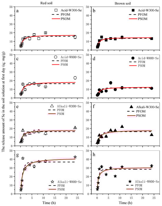 To evaluate the release kinetics in red soil and brown soil, the four Se fertilizers, including Acid-W300-Se, Alkali-W300-Se, Acid-W800-Se, and Alkali-W800-Se, were added to red soil or brown soil extracts [38,39]. Pseudo-first-order kinetics and pseudo-second-order kinetics models were used to fit the Se-releasing data on the first day. The release of four PEI-modified biochar Se fertilizers in both red soil and brown soil extracts were well fitted with pseudo-second-order kinetic fitting (Figure 7, Table 3). This indicated that the release of four PEI-modified biochar-based Se fertilizers in red soil or brown soil might be through the ion exchange reaction. The anion concentration (SO42−, Cl−, and NO3−) in red soil extract was higher than that in brown soil extract (Table S4). This led to the equilibrium release amounts of Acid-W300-Se, Alkali-W300-Se, Acid-W800-Se, and Alkali-W800-Se in red soil extracts being all higher than those in brown soil extracts on the first day [30,37,38].