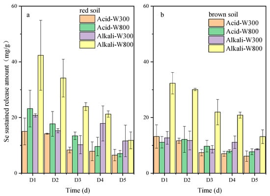 In brown soil, Alkali-W800 also showed similar characteristics, and its 5-day release in the brown soil extract was 118.33 mg/g, about 37.67% of its total loading Se. However, the Se release amounts of Acid-W300-Se for 5 days in red soil and brown soil were 83.43 mg/g and 72.87 mg/g, accounting for 18.07% and 15.79% of the total Se in Acid-W300-Se, respectively (Figure 8). As mentioned above, the Se in Alkali-W800-Se and Acid-W800-Se was mainly connected with amino groups through imine- and amide-bonding. The Se in those fertilizers was easily exchanged by anions in the soil solution. This led to the Se of Alkali-W800-Se and Acid-W800-Se being released quickly in the soil solution, which might cause the loss of Se [41,42,43]. In addition to the imine- and amide-bonding with selenium, a large part of selenium was through a chemical reaction with the C=N in Acid-W300 to form C-Se. This led to the Se release of Acid-W300-Se being controlled and slowed in red and brown soils. Studies showed that low-temperature pyrolysis biochar was more likely to age and decompose in the soil [13]. The Se in Acid-W300-Se will be continuously released with biochar aging to increase a crop’s Se content [42,44,45].