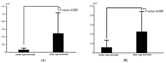 Needle-type electrodes induced several smaller bone particles than plate-type electrodes in the targeted muscles. Needle-type electrodes require less electricity than plate-type electrodes (Figure 1C,D). The electric capacity of needle-type electrodes was represented in a two-dimensional area (Figure 1C), whereas that of plate-type electrodes could affect the three-dimensional area (Figure 1D). The electric field distribution might be an important factor in inducing uniformity over the plate compared with needle-type electrodes [47]. This may have contributed to the small particles of ectopic bone induced by needle-type electrodes in the target areas. However, some studies have reported that needle-type electrodes provide larger amounts of plasmid DNA in electroporation volumes than plate-type electrodes [48,49]. Therefore, bmp-2 gene transfer to skeletal muscle with needle-type electrodes could be repeatedly performed. If small bone particles are separated, we can repeat gene transfer with needle-type electrodes to induce one-block bone formation after a clinical X-ray examination.