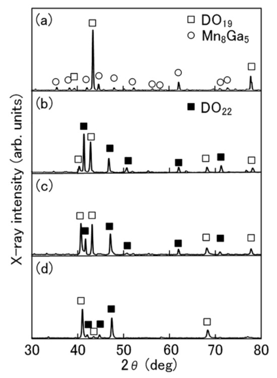 - Saito, T.; Nishimura, R. Hard magnetic properties of Mn–Ga melt-spun ribbons. J. Appl. Phys. 2012, 112, 083901. [Google Scholar] [CrossRef]