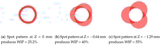 Variations in the WIP value for the experiment were achieved by placing the beam convergence position below the work plane, resulting in the beam spot patterns indicated in (a–c).