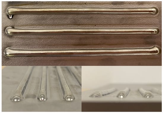 Nine beads were deposited on each plate according to the randomized run order and specified process parameters to make up the 18 total experimental runs. Each bead has a length of 76.2 mm, and they were separated by 10.5 mm. Pictures of three sample beads are shown in Figure 4. To measure the profile of the deposits, each plate was scanned using a Revopoint MINI 3D Scanner with a precision of 0.02 mm. Prior to scanning, the deposits were sprayed with a thin layer of AESUB Orange Scanning Spray to make the surface non-reflective. The scan produced an STL file of the nine beads and the substrate surface. Figure 5a shows the height profile of the scanned deposits at the midpoint of the length of the beads. From the raw midpoint scan data, it can be seen that there is significant warping in the substrate due to induced residual stresses from the deposition process. To properly measure the bead geometry, the curvature of the substrate must be removed. Figure 5b shows the raw data decomposed into the red substrate lines and the blue peaks that represent the deposited beads.