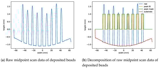 Using the decomposed scan data, the substrate was flattened to its original state prior to deposition and the peaks were flattened and reattached to the substrate, shown in Figure 6a. From the conditioned profile data, the maximum value of each peak was found to measure the height of each bead. The width of the beads was measured as the bead width 0.05 mm above the flattened substrate surface. Figure 6b graphically shows the width and height measurements.