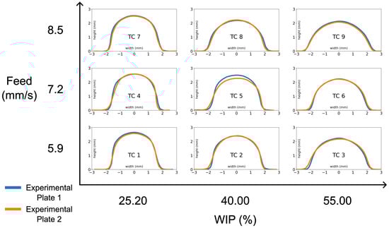 Cross-sectional profile at the midpoint of the beads for all nine tested treatment combinations of varying feed rate and WIP. The two plotted bead profiles on each graph represent the two experimental runs per treatment combination.