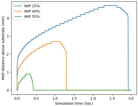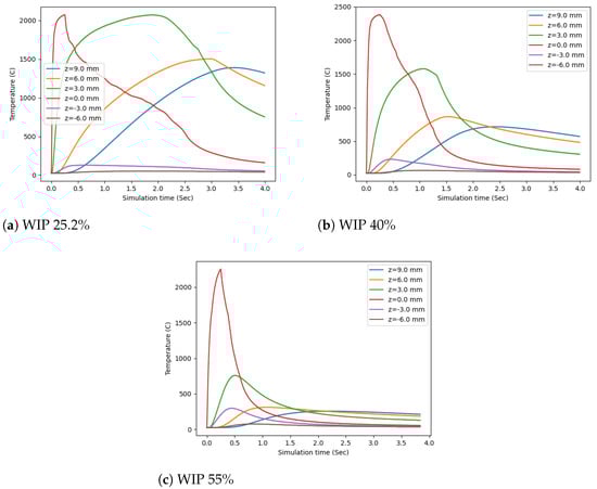 To analyze the simulation results, several plots were created. The first of these was created to inspect the temperature along the center axis of the wire. For each time step saved to disk, the temperatures at six different z values were selected. The first was at the intersection of the wire and the substrate (z = 0.0 mm), three were taken within the wire (z = 9.0 mm, z = 6.0 mm, and z = 3.0 mm), and two were measured in the substrate (z = −3.0 mm and z = −6.0 mm). These were plotted in Figure 9. This method showed that the maximum temperature of the central axis of the wire always occurred where contact with the substrate occurred, z = 0.0 mm, at 2074 C, 2384 C, and 2255 C for a WIP of 25.2%, 40%, and 55% respectively. This value was always reached during the laser irradiation for the first 0.25 seconds of the simulation. The heat distribution was very dependent on the WIP value, as can be seen in the distribution of the lines, where lower WIP values had temperature profiles that were much more widely distributed and higher WIP values had a much tighter thermal distribution. This follows the expected trend that a lower WIP value will introduce more energy directly into the wire and a higher WIP value will introduce more energy into the substrate. In the substrate, there is more thermal mass for the heat to be quickly distributed, resulting in a much tighter thermal distribution. Meanwhile, when heat is introduced into the wire with a much smaller thermal mass, it cannot dissipate as much and will create a much greater thermal distribution.