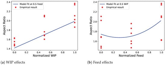 Using only the significant factors, a new model was created for which the parameter estimates for the normalized variables are shown in Table 6. The model was generated using the statsmodel Python library and is a multiple linear ordinary least squares regression. The effects plots for this model were generated and are shown in Figure 10. To show the general trend of each of the experimental factors, the model fit at 0.5 of the normalized variables was plotted along with all the measured aspect ratio results. Each of the plots shows a general trend upwards in aspect ratio with increasing either factor, although the feed effect has some curvature. Over the tested ranges, changes to the WIP had a larger impact on the output aspect ratio. This can be seen in Figure 8, where the changes in the WIP setting had a greater effect on the resulting bead shape compared to the changes in the feed rate setting. These estimates yield Equation (2), which predicts the bead AR for a given feed rate in mm/s and a WIP in % over the respective original parameter ranges. The R-squared value for the model is 0.926, which indicates a good fit between the model and the experimental data.