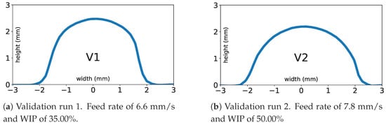 To test the performance of the model with previously untested treatment combinations, two model validation runs were deposited and their bead geometries were measured. Table 7 shows the deposition process parameters for each run and the resulting mean measured AR and model-predicted AR. For each validation run, the model prediction has about 4% error from the experimentally measured value of AR. Figure 11 shows midpoint scans of the validation deposits.