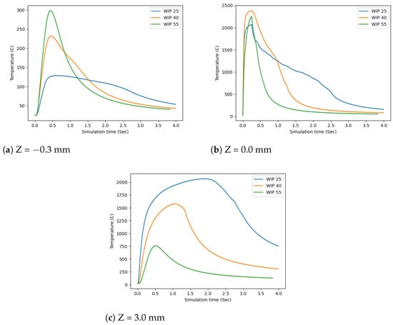 To compare the model and use it as a predictor of the experimental results, the temperature profile for each of the WIP values was plotted for z = −3.0 mm, z = 0.0 mm, and z = 3.0 mm in Figure 12a–c, respectively. This showed that, at the interface of the wire and the substrate, z = 0.0 mm, there was limited difference for the duration of time when the laser was on. However, as the build cooled, there was a visible difference due to the distribution of the heat in the wire vs the substrate. This trend of differing distributions can also be seen at z = −3.0 mm and z = 3.0 mm, where a higher WIP will put more energy into the substrate and a lower WIP will put more energy into the wire.