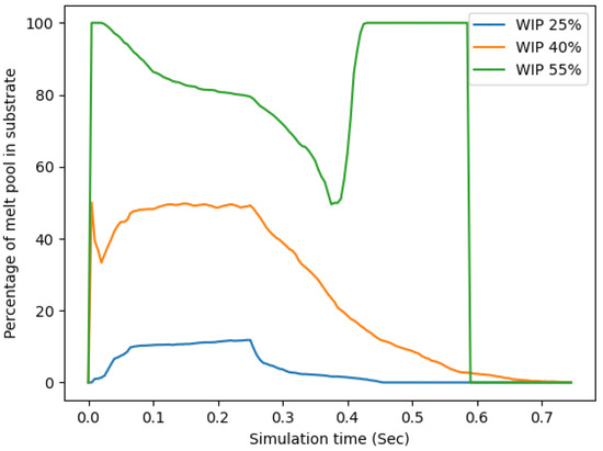 The last method of analyzing the data took into account these last two results and calculated the percentage of the melt pool that was located in the substrate vs in the wire. This is shown in Figure 15. This plot showed that the WIP value predicted the amount of the melt pool that would be in the substrate; indeed, the smaller the WIP, the less the melt pool would be located in the substrate. This last method of comparing the distribution of the melt pool location has been the one that appears to be the best predictor of the aspect ratio of the completed build. This is due to its accounting for the amount of wire that is melted and can be placed onto the substrate along with the amount of substrate that is melted and ready to receive the new material. In cases of low WIP, most of the melted material is in the wire with a small amount in the substrate, making for a narrow deposited track. With higher WIPs, there is more melted material in the substrate, which allows the melted wire material to more easily spread out and make a wider bead. These trends are supported by the experimental study. This style of simulation with consideration of additional process parameters can be used as a predictor of deposition stability, bead geometry, and substrate dilution.