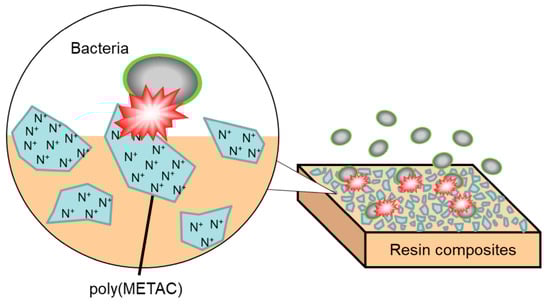 Poly[{2-(methacryloyloxy)ethyl}trimethylammonium chloride] (poly(METAC)) is a methacrylate-type cationic polymer that comprises QAC (Figure 1). METAC was reported to demonstrate antibacterial effects when polymerized alone via radical polymerization or when copolymerized with other types of monomers [7]. Considering the short alkyl chain length of METAC, the antimicrobial activity of poly(METAC) is probably derived from the charged nitrogen atom of quaternary ammonium, which concentrates the positive charge. In the dental field, adhesive resins or resin sealants containing the METAC monomer have been reported to demonstrate the contact inhibition of Streptococcus mutans on their surfaces [8,9]. However, the antibacterial effects of resin composites containing poly(METAC) have not been investigated. According to the emulsion principle, water-soluble METAC monomers agglomerate when incorporated into resin composites. Therefore, clusters of poly(METAC) may be formed in resin composites by aggregating and polymerizing METAC monomers. Resin composites incorporating poly(METAC) clusters were hypothesized to exhibit bactericidal effects on their surfaces because of the high density of charged nitrogen atoms in METAC (Figure 2). This study aimed to fabricate resin composites incorporating poly(METAC) clusters and evaluate their antibacterial effects.