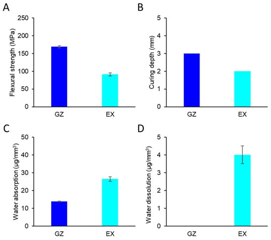 The physical properties of EX and GZ (n = 3). Error bars represent the standard deviation. (A) Flexural strength. (B) Curing depths. (C) Water absorption. (D) Water dissolution.