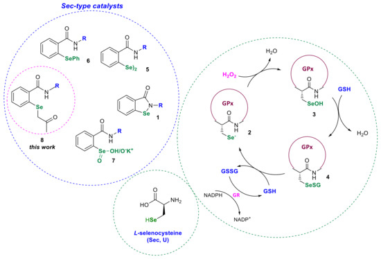 GPx activity cycle and examples of Sec-type catalysts 1, 5–8.