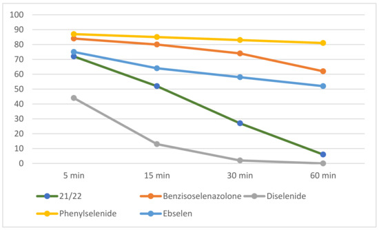 The ability to reduce hydrogen peroxide was evaluated by a conventionally used assay presented by Iwaoka and co-workers [25]. The method is based on the oxidation of the Se catalyst to its active species 25 by H2O2, which is later reduced to its initial form by dithiothreitol (DTTred). The dithiol DTT is simultaneously transformed into a disulfide (DTTox). 1HNMR spectra, recorded in specific time intervals, present the rate of the dithiol formation, which equals the rate of H2O2 reduction. The results of the performed analysis are shown in Table 2.