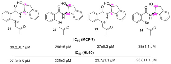 In the context of interaction with chiral biological targets, the most interesting phenomenon is to observe a difference in the activity between two enantio- or diastereoisomers. It was observed in the case of N-cis-2-hydroxy-1-indanyl derivatives 21 and 22. When the stereochemistry of the C1 and C2 carbon centers was 1R,2S, the bio-activity towards both cell lines significantly decreased compared to the 1S,2R isomer. The trans epimers 23 and 24 also presented almost 10-fold more reactive than selenide 22 (Figure 3).