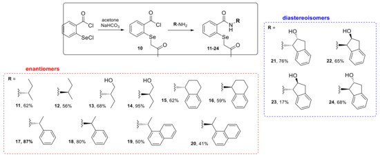 The selected conditions proved efficient for a variety of chiral amines. In one-pot synthesis, 2-(chloroseleno)-benzoyl chloride was first transformed in situ to the acetylated selenide 10. Subsequent reactions with commercially available enantiomerically pure amines furnished a series of β-carbonyl selenides as enantiomeric and diastereomeric pairs in good yields (Scheme 1).