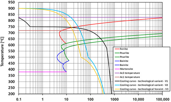 Figure 1 shows part of the DTTT (Deformation Time Temperature Transformation) graph with phase transformation curves and cooling curves according to variants V1–V3, obtained as a result of numerical modeling of the thermoplastic processing of the analyzed rolling process for 5.5 mm diameter wire rods of 20MnB4 steel.