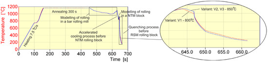 As indicated, inter alia, in [1,33,34,35,36], in order to obtain a finished product with uniform fine-grained ferritic–pearlitic microstructure variations, the final stage of deformation (rolling in the RSM rolling block) should take place in the single-phase (austenitic) range, when its temperature is 30 ÷ 80 °C higher than the temperature at the beginning of the austenite transformation Ar3.