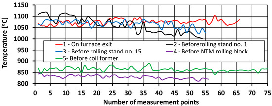 In the subsequent stages of the rolling process, due to successive thermoplastic processing operations, a decrease in cross-sectional area, an increase in rolling speed, accelerated cooling, the generation and conduction of heat resulting from plastic strain, and shorter intervals between deformations, it was found that the surface temperature difference along the length of the rolled band decreased again. The average surface temperature of the rolled material in front of rolling stand No. 15 was approximately 1065 °C. In contrast, the temperature difference along the length of the processed material at this point of the rolling line was approximately 66 °C (Figure 5). The average surface temperature of the material before being processed in the NTM rolling block was approximately 830 °C, while the temperature difference along the band at this point of the rolling line was approximately 34 °C (Figure 5). The average surface temperature of the band in front of the wire coil former was about 863 °C, while the temperature difference along its length at this point in the rolling line was about 48 °C (Figure 5).