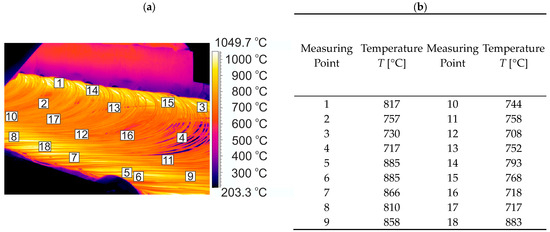 Example of temperature distribution on the surface of 20MnB4 steel wire rod at the entry to the STELMOR® roller conveyor: (a) thermogram, (b) temperature value at measuring points.